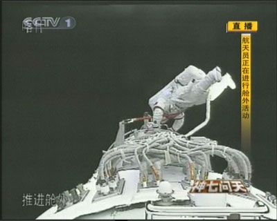 9月27日,“神七”航天員翟志剛出艙活動結(jié)束返回軌道艙。