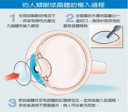 目前也有其它種人工制成的塑料眼球晶體在臨床上使用,不過因彈性不足,只能解決近視或遠(yuǎn)視其中一種毛病,更談不上根治老花眼。
