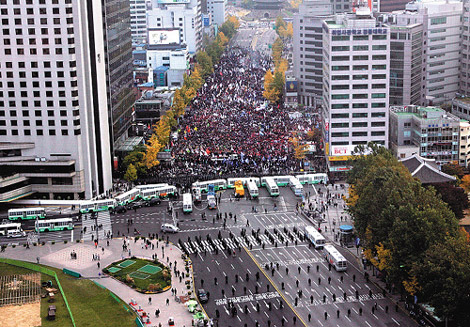 在首爾市政廳附近的這起示威,組織者稱有5萬人參加,最后約有100人遭逮捕,警民雙方共約60多人受傷。美韓歷經(jīng)長久談判,在今年6月簽署自由貿(mào)易協(xié)議、同意降低或撤除商品關稅和其它貿(mào)易壁壘。