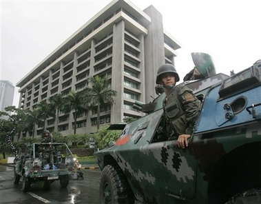 據(jù)報道,這些菲律賓叛軍29日占領(lǐng)馬尼拉半島酒店,要求總統(tǒng)阿羅約辭職。政府給予那些士兵的投降限期已屆滿。政府此前要求這些士兵限期無條件投降。