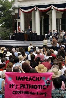 據(jù)香港《文匯報》等媒體報道,布什在第3任總統(tǒng)兼《獨立宣言》起草人杰斐遜在弗州夏洛茨維爾的故居發(fā)表為時僅有10分鐘的演說,期間至少9名示威者被押送離開。有示威者呼喊“彈劾布什!”又有示威者罵他“戰(zhàn)犯”。