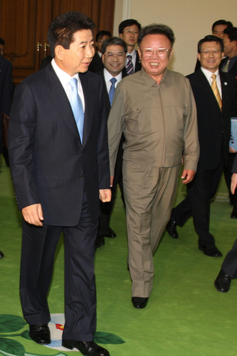 資料圖:去年10月3日,韓國總統(tǒng)盧武鉉與朝鮮國防委員長金正日舉行首次首腦會(huì)談時(shí),就金正日前一天親自出來迎接表達(dá)謝意,而金正日對此以“我又不是患者”來回應(yīng),再次表現(xiàn)出其幽默的一面。