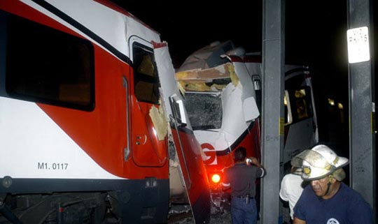 墨西哥城民防秘書莫雷諾說,事故發(fā)生在當(dāng)?shù)貢r(shí)間晚上10點(diǎn)20分,情況相當(dāng)復(fù)雜,十分混亂;疖囀窃趶牟及<{維斯塔到瓜烏蒂特蘭的鐵路上,圣拉法埃爾站與萊切里站之間相撞的。受傷人員已經(jīng)被送到醫(yī)院治理。發(fā)生事故的原因目前還不清楚。(人民網(wǎng)4月19日訊/管彥忠)