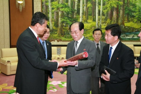 中新網5月6日電 中國駐朝鮮大使館網站消息,5月5日,朝鮮最高人民會議常任委員會委員長金永南受朝鮮勞動黨總書記金正日的委托,在萬壽臺議事堂會見了中國駐朝鮮大使劉曉明。劉大使請金永南委員長轉達中共中央總書記、國家主席胡錦濤致金正日總書記的口信和親切問候。金永南委員長表示感謝并允轉達,同時也請劉大使轉達金正日總書記對胡錦濤總書記的親切問候。