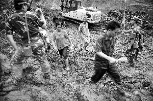 負(fù)責(zé)挖掘的武警交通直屬工程部的周偉表示,為了確保安全,避免次生災(zāi)害,大型挖掘機(jī)的挖掘工作到下午四點(diǎn)左右才開始。他說,為了保證遺體的完整,他們挖掘的時(shí)候都會非常小心。在現(xiàn)場,由于垮塌的直線距離幾百米,幾臺挖掘機(jī)分層次挖掘。挖出一大鏟泥土后,從高處落下,看是否有遺體存在。