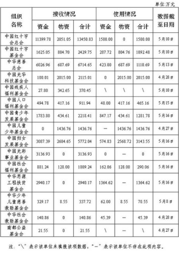 截至5月16日,中國紅十字會總會和14家在民政部登記的社會組織向民政部報送了救災捐贈統(tǒng)計數(shù)據。