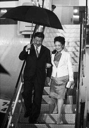 習(xí)近平和夫人彭麗媛走下舷梯。