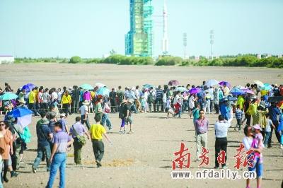 、俑瓯诟沟,藍(lán)天下,發(fā)射塔內(nèi)的神舟十號飛船和長征2F遙十火箭組合體揭開其神秘的面紗,航天城的居民、各路記者以及嘉賓游客云集于此,目睹這載入歷史的一刻。