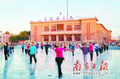 、诤教斐莾(nèi)東風(fēng)禮堂對面的廣場上的居民們載歌載舞。