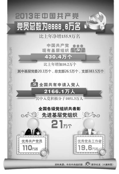 中央組織部最新黨內(nèi)統(tǒng)計數(shù)據(jù)顯示,截至2013年底,中國共產(chǎn)黨黨員總數(shù)為8668.6萬名,比上年凈增155.9萬名,增幅為1.8%;黨的基層組織總數(shù)達430.4萬個,比上年增加10.2萬個,增幅為2.4%。數(shù)據(jù)表明,中央關于黨員隊伍建設和基層黨組織建設的新部署新要求得到了較好落實。