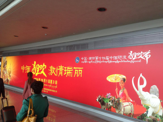 11月10日,記者在昆明長水國際機(jī)場轉(zhuǎn)機(jī)前往緬甸時(shí)在機(jī)場拍下的中緬胞波狂歡節(jié)宣傳廣告。(新華社記者 桂濤攝)