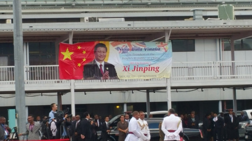 雖然時(shí)間短暫,但斐濟(jì)對(duì)習(xí)大大的到來那是相當(dāng)?shù)闹匾。傍晚,?xí)大大專機(jī)抵達(dá)楠迪國際機(jī)場時(shí),斐濟(jì)總理姆拜尼馬拉馬夫婦親自到舷梯旁迎接,并在機(jī)場舉行歡迎儀式。楠迪街頭,隨處可見習(xí)大大巨幅照片,當(dāng)?shù)厝藫]舞兩國國旗,在中國代表團(tuán)車隊(duì)經(jīng)過的路線沿途迎接。