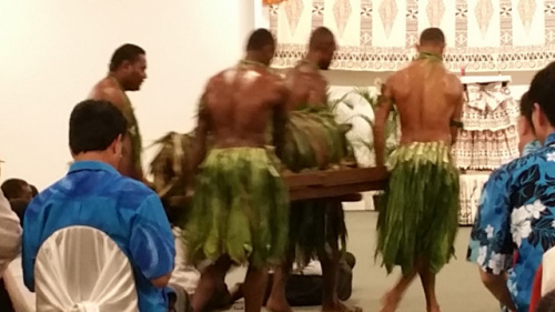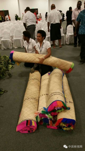 一名斐濟(jì)原住民將草席獻(xiàn)至習(xí)大大面前,另一人手持鯨魚牙向習(xí)大大致祝福語并獻(xiàn)上鯨魚牙。咦,不是剛剛獻(xiàn)過一次嗎?不管那么多了,接過鯨魚牙再次轉(zhuǎn)交給斐濟(jì)禮賓官,禮賓官向獻(xiàn)禮人拍掌并表示感謝。之后,斐濟(jì)原住民將草席撤下。