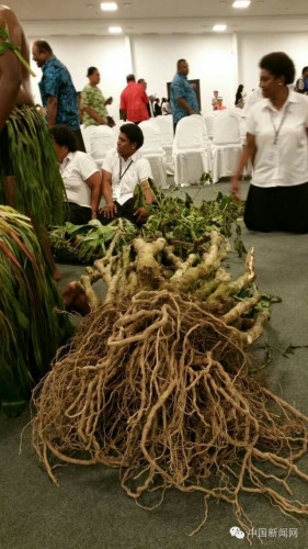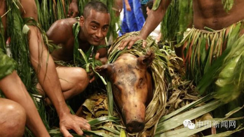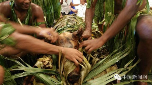 喝完卡瓦汁,斐濟(jì)原住民又把烤豬、芋頭什么的抬上來啦,一人還上前致祝福語。習(xí)大大點(diǎn)頭致意。斐濟(jì)禮賓官代表習(xí)大大接受獻(xiàn)品并致謝。然后,原住民將食物抬下。