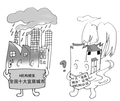爭議之二,評選結果頻頻鬧出“烏龍”事件。最典型的例子是2005年,重慶市剛被某商業(yè)機構高調評為“中國十大宜居城市”沒幾天,環(huán)?偩志统鼍邎蟾,認定重慶屬于“十大污染城市”之列。