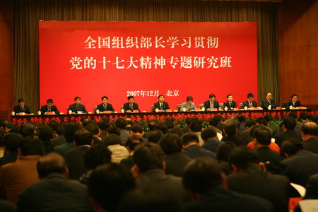 中新網(wǎng)12月14日電 據(jù)中國人事報(bào)報(bào)道,中國全國組織部長學(xué)習(xí)貫徹黨的十七大精神研究班12月9日至11日在京舉行。中共中央政治局委員、書記處書記、中央組織部部長李源潮與全體研究班學(xué)員座談交流并發(fā)表講話強(qiáng)調(diào),組織系統(tǒng)要深入學(xué)習(xí)十七大提出的新思想,落實(shí)十七大提出的新舉措,樹立十七大要求的新形象,努力做學(xué)習(xí)貫徹十七大精神的模范。