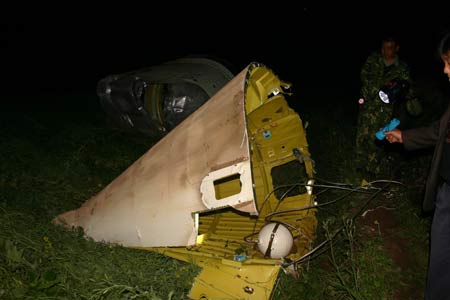 約莫15分鐘,在一個觀察哨值勤的觀察員王世華突然報告,稱殘骸就落在他附近約200米的山溝里,殘骸目標(biāo)已發(fā)現(xiàn)。山溝里沒有住戶,未造成人員傷亡和房屋、林木的損毀。