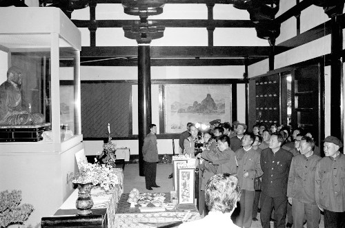 建于公元1688年的御影堂內(nèi),供奉著鑒真乾漆夾造的坐像,高2尺7寸,面向西方,雙手拱合,結(jié)跏跌坐,團(tuán)目含笑,兩唇緊斂,表現(xiàn)鑒真于公元763年圓寂時(shí)的姿態(tài),已被定為日本國(guó)寶,每年只開(kāi)放3天供人瞻仰。日本著名畫家東山魁夷為御影堂繪制的68幅屏障壁畫,有《云影》、《濤聲》、《黃山曉云》、《揚(yáng)州薰風(fēng)》、《桂林月宵》和《瑞光》等。