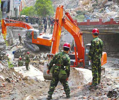 5月15日,記者看到,中國(guó)人民解放軍第二炮兵及北京路橋、四川路橋和華西集團(tuán)的挖掘機(jī)、推土機(jī)等重型施工機(jī)械經(jīng)過(guò)長(zhǎng)途開(kāi)進(jìn),突入北川,立即投入,晝夜不停。四臺(tái)挖掘機(jī)在探照燈照射下,緊張施工,機(jī)械手輪流操作,機(jī)器徹夜不停轉(zhuǎn)。