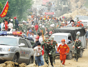 5月17日下午3時40分,記者再次來到北川,剛剛走到救援部隊的大本營——任家坪時,就發(fā)現(xiàn)大量的災民和救援人員往外涌,行進的車輛和腳步匆匆的人群使路面揚起了陣陣灰塵。重慶消防支隊一位戰(zhàn)士告訴我們,因為北川后側(cè)山頂?shù)乃畨慰赡軟Q堤,1個小時前已經(jīng)發(fā)出信號彈,要求救援人員和災民撤離北川縣城。