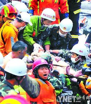 6點(diǎn)10分,手已經(jīng)伸了出來(lái),肩膀還卡著。消防隊(duì)員找了一塊門(mén)板,做好了最后的準(zhǔn)備。由于是五層樓坍塌,層層疊加在上面,都是水泥板,后面有木板,只能掏一個(gè)洞慢慢掏進(jìn)去。但是到下午,卞剛芬生命體征開(kāi)始變得衰弱,消防人員用一根管子,不斷給她喂水和牛奶,并不時(shí)和她聊天給她鼓勵(lì)。下午6點(diǎn)15分,在一片歡呼聲中,卞剛芬被成功救出。現(xiàn)場(chǎng)的醫(yī)療人員迅速對(duì)其進(jìn)行身體特征的檢查并對(duì)其輸液,F(xiàn)場(chǎng)響起一片掌聲。(馬輝 周春林)