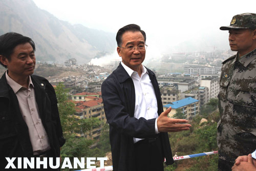 下午5時10分許,一抵達(dá)綿陽機(jī)場,溫家寶總理就和國務(wù)院副總理回良玉、國務(wù)委員馬凱以及總指揮部其他成員一起改乘直升機(jī)前往北川察看唐家山堰塞湖,看望禹里鄉(xiāng)準(zhǔn)備轉(zhuǎn)移的群眾,并前往在地震中遭受嚴(yán)重毀壞的北川縣城,了解受災(zāi)情況。