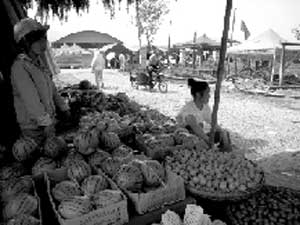 鎮(zhèn)政府前的馬路兩邊,搭滿安置受災(zāi)群眾的帳篷。有幾個(gè)帳篷前支起西瓜攤兒,顧客并不多,攤主們聊著天。