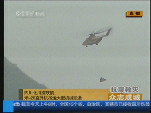 中新網(wǎng)綿陽5月26日電(霍潺)今天上午十一點(diǎn)零五分左右,一架紅色米-26直升機(jī)吊裝了一臺重約十三點(diǎn)二噸的重型挖掘機(jī)已起飛,前往唐家山堰塞湖壩體,大約二十多分鐘可以往返。