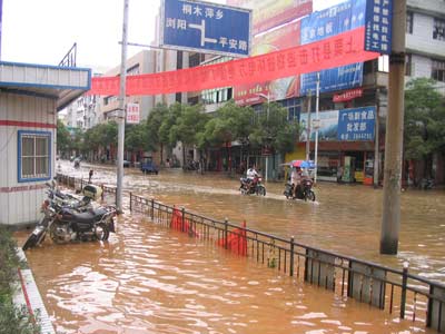 該繁華街區(qū)密集了數(shù)百個商場和店鋪。在府前路開店的一名伍姓店主一臉無奈地對記者說,近幾天來,他一直都忙碌著為端午節(jié)而進貨。按照往年的慣例,他都得進6萬多元的貨物。28日凌晨2時,他趕到自己所開店位置時,發(fā)現(xiàn)店門的一半位置已被洪水淹沒。沿街走過一段齊腰深的水路進店后,驚訝地發(fā)現(xiàn),店內用來準備過節(jié)的貨物全被洪水浸泡。伍某說,這回他店內損失估計在7萬元以上。