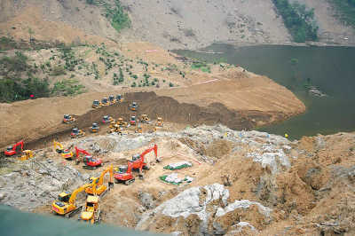 31日晚8時,記者在唐家山堰塞體一側(cè)的山坡上看到,一條土黃色的溝渠圍繞著堰塞體的左側(cè),除了靠近堰塞湖處的泄流槽仍有兩臺挖掘機和兩臺推土機在施工外,現(xiàn)場其他的機械都已停工,并統(tǒng)一停放在一處高地上。