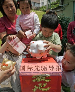 5月15日,天津和平區(qū)保育院的兒童帶著自己的存錢罐,向四川地震災(zāi)區(qū)捐獻(xiàn)自己的“積蓄”。劉海峰/攝