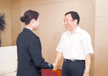 圖為賀國強與“抗震救災優(yōu)秀紀檢監(jiān)察干部”蔣敏親切握手。(李玉龍 攝)