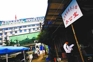 昨日,平武縣政府大院,辦公室人員在帳篷里處理事務。政府大樓已經(jīng)成為危房。 本報記者 秦斌 攝