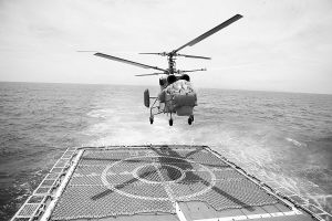 “方位××度,距離××鏈,目標正在急速突破我海區(qū),請求直升機突擊!”接到命令,空中反潛直升機迅速撲向目標海區(qū)。開艙,投彈,數(shù)分鐘后,目標被一舉擊沉。