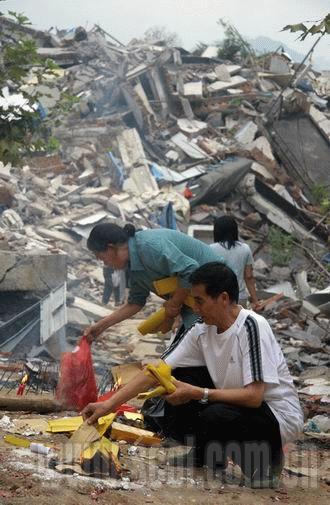 坐在老縣城畜牧局宿舍樓下,46歲的陳幫金無言地看著幫工扎紙人。這里,曾經(jīng)充滿了他和妻子的歡笑。但地震那天,44歲的妻子在新縣城天然氣公司附近遇難,按照當(dāng)?shù)仫L(fēng)俗,陳幫金要等紙人扎好后,和兒媳、弟妹一起,翻過廢墟到妻子遇難的地方祭拜。此景悲涼,陳幫金一家仍充滿了感激:“全靠政府政策好,從13日起就開禁了,不然我們都不曉得什么時候才能回來拜一下!