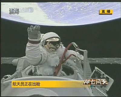 翟志剛以頭先腳后的方式進(jìn)入太空,16時(shí)44分,他聲音洪亮的向地面報(bào)告:“神舟七號(hào)已出艙,身體感覺良好,向全國人民,向全世界人民問候!