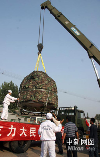 “神七”載人飛船返回艙運抵北京。中新社記者 孫自法 攝