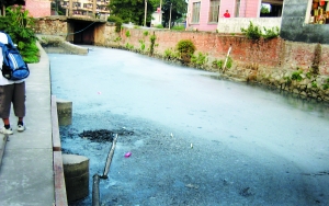 昨日上午,記者趕到位于石井潭村附近的這家垃圾壓縮站外,此時之前銷毀的盒裝牛奶外包裝已經(jīng)全部打包運往垃圾場填埋,垃圾站內(nèi)的地面也已經(jīng)清洗干凈,看不到之前這里曾銷毀盒裝牛奶的痕跡。但就在垃圾站后方的大方涌內(nèi),仍然可以清晰地看到,原本較黑的水面之上,混雜著厚厚一層乳白色的液體,遠遠望去白茫茫一片。