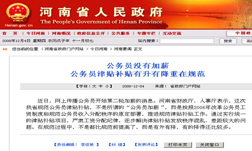 河南省澄清公務員加薪傳聞