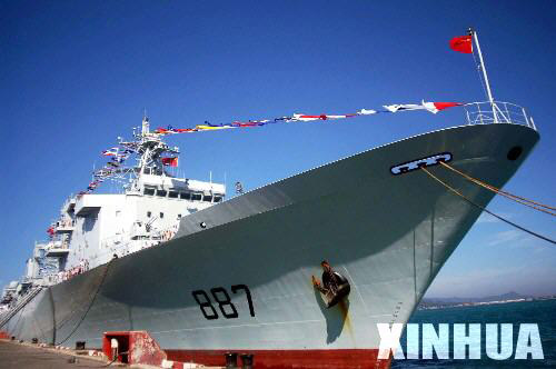 該艦于2003年7月1日黃埔造船廠下水,2004年4月服役,編入南海艦隊(duì)。是我國(guó)自行設(shè)計(jì)建造最大補(bǔ)給艦,艦長(zhǎng)171.4米,寬24.6米,吃水深度9米,排水量23000噸,兩臺(tái)柴油發(fā)動(dòng)機(jī)雙軸驅(qū)動(dòng),可同時(shí)為兩艘以上艦船補(bǔ)給,主要用于遠(yuǎn)洋補(bǔ)給。最大航速19節(jié),續(xù)航力10000/14節(jié)。船員130名,推測(cè)物資容量為燃油10500噸,水250噸,干貨彈藥680噸。裝備4門76F雙聯(lián)裝37mm 63倍徑機(jī)炮。