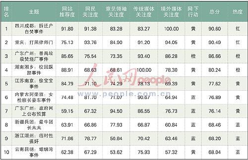 傳統(tǒng)媒體關(guān)注度由100多家中央級媒體、市場化媒體、廣播電視媒體等三類媒體的報道數(shù)量做加權(quán)處理后統(tǒng)計所得;網(wǎng)站推薦由主要新聞網(wǎng)站的網(wǎng)站報道評論數(shù)、專題數(shù)、在線調(diào)查數(shù)、嘉賓訪談次數(shù)等4項數(shù)據(jù)做加權(quán)處理后統(tǒng)計所得;網(wǎng)民關(guān)注度由網(wǎng)民在主要網(wǎng)絡(luò)社區(qū)/BBS、博客上的發(fā)表(發(fā)帖)量、瀏覽量數(shù)據(jù)做加權(quán)處理后統(tǒng)計所得;意見領(lǐng)袖關(guān)注度由400余位“意見領(lǐng)袖”的博文、BBS帖文和在學(xué)術(shù)文化類網(wǎng)站發(fā)表的言論三項數(shù)據(jù)做加權(quán)處理后統(tǒng)計所得;境外媒體關(guān)注度依據(jù)對路透社、BBC、美聯(lián)社、紐約時報、泰晤士報、星島日報、聯(lián)合早報、FT中文網(wǎng)、鳳凰網(wǎng)等25家境外媒體的報道數(shù)量統(tǒng)計、處理后所得;網(wǎng)下行動依據(jù)各事件所引發(fā)的網(wǎng)下行動的規(guī)模、激烈程度進(jìn)行評估后所得,分為紅、橙、黃、藍(lán)四個級別,熱度相應(yīng)由高至低。