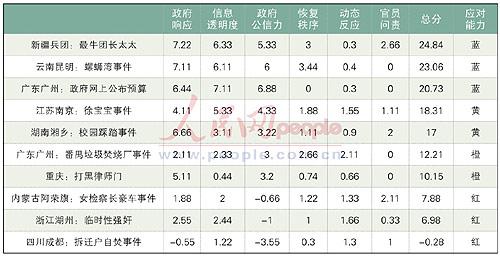 人民網(wǎng)輿情監(jiān)測室從100多家境內(nèi)外報刊的新聞報道和評論,8家門戶網(wǎng)站的新聞跟帖,約30家論壇/BBS,400余名網(wǎng)絡(luò)“意見領(lǐng)袖”博客,以及微博客、QQ群和播客網(wǎng)站中,梳理出了2009年第四季度十件“輿情熱點事件”,并按照“政府響應(yīng)、信息透明度、政府公信力”3個常規(guī)指標(biāo),以及“恢復(fù)秩序、動態(tài)反應(yīng)、官員問責(zé)”3個特殊指標(biāo),對2009年第四季度十件“輿情熱點事件”的政府應(yīng)對、處置能力做出了評估,結(jié)論是: