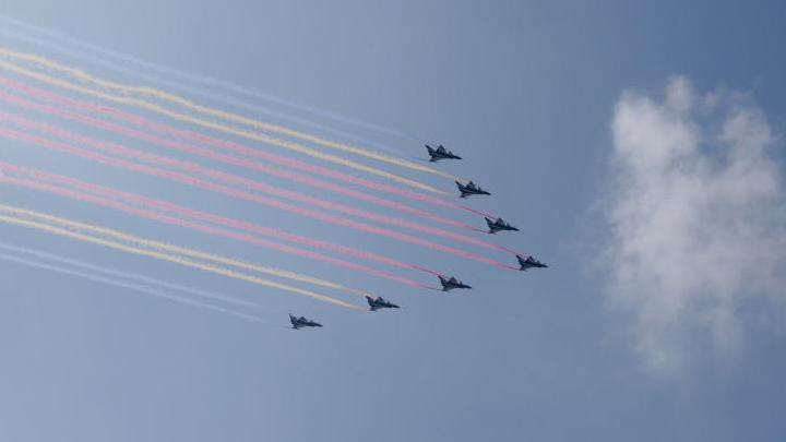 空中護(hù)旗梯隊(duì)飛過(guò)天壇上空