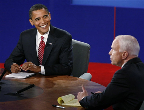 美國共和黨總統(tǒng)候選人麥凱恩和民主黨總統(tǒng)候選人奧巴馬于美東時(shí)間15日晚上9時(shí)(北京時(shí)間16日早上9時(shí))在紐約霍夫斯特拉大學(xué)展開總統(tǒng)選舉投票前的最后一場電視辯論。雙方坐在同一張桌子前就各自的經(jīng)濟(jì)計(jì)劃展開唇槍舌戰(zhàn)。