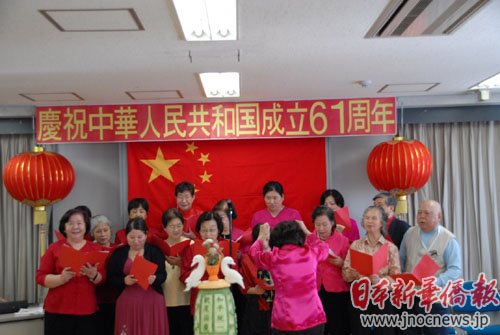 東京各界華僑和應邀前來參加活動的日中友好會館、在日朝鮮人總聯(lián)合會、在日大韓民國民團、日本新華僑華人會、在日中國企業(yè)協(xié)會、日本中華總商會、橫浜華僑總會、長野華僑總會等團體在中華人民共和國61年國慶前夕齊聚一堂,華人華僑的愛國思鄉(xiāng)之情涌上心頭。席間,東京華僑婦女會會長吳少煖帶領(lǐng)婦女會員們?yōu)榇髸I唱一曲《五星紅旗》,不僅抒發(fā)了大家思念之情,更激發(fā)了眾人的愛國激情。吳少煖包含激情地表示:“我們獨在異鄉(xiāng)為異客,每逢佳節(jié)倍思親。雖然身在異鄉(xiāng),但是思念祖國的心是一直沒有改變過的。望祖國今后更加繁榮富強。”