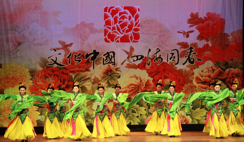 晚會(huì)以開場(chǎng)舞《花開中華大團(tuán)圓》開始,苗族舞蹈《春暖花開》、蒙古族舞蹈《奔騰》、彝族舞蹈《阿西里西》等充滿民族風(fēng)情的舞蹈,為觀眾展示了中華民族大家庭豐富多彩的特色文化。國(guó)家一級(jí)演員劉維維和魏金棟今晚為觀眾精心演繹了《草原上升起不落的太陽(yáng)》、《為祖國(guó)干杯》、《可愛的一朵玫瑰花》和《北國(guó)之春》等經(jīng)典曲目,讓現(xiàn)場(chǎng)僑胞或沉醉,或激動(dòng)。最后登場(chǎng)的集體舞《千手觀音》則讓觀眾一睹這一著名節(jié)目的風(fēng)采,引發(fā)了觀眾們的熱烈反響。將現(xiàn)場(chǎng)氣氛推向高潮。