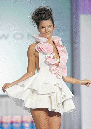 黃嘉宜是來(lái)自溫哥華的設(shè)計(jì)師。學(xué)時(shí)裝設(shè)計(jì)的她,在兩年前擁有了自己的時(shí)裝公司。她的設(shè)計(jì)以性感、女性主義和現(xiàn)代感著稱。她表示,在用廁紙?jiān)O(shè)計(jì)時(shí)裝時(shí),首先想到的是要給觀眾一種很難相信這衣服是用廁紙制成的感覺(jué)。因此,她特地要體現(xiàn)出與廁紙的柔軟相反的一種挺括的質(zhì)地,于是要在廁紙下加硬襯。結(jié)果是,她的設(shè)計(jì)本身就有一種雕塑般的感覺(jué)。