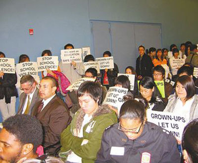 南費城高中亞裔學生、家長和華埠小區(qū)領袖百余人,9日下午手持“是誰讓它發(fā)生”等抗議標語,游行至教育局參加公聽會,游行者高喊“停止學校暴力”、“給我安全教育環(huán)境”,抒發(fā)壓抑多時的不滿。