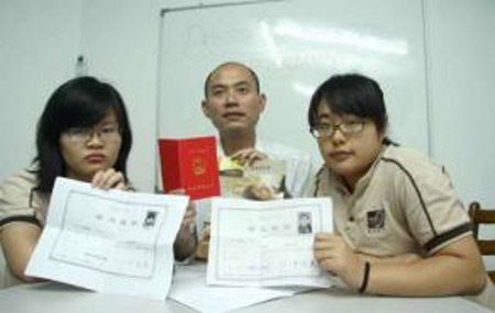 林立迎(中)與兩名申訴雇主沒有為他們辦理工作準(zhǔn)證、扣留國際護(hù)照及未發(fā)出薪水的中國籍女子,展示她們的職業(yè)資格證書等個(gè)人證件復(fù)印本。右為朱新紅,左為邱美娟。(馬來西亞《星洲日?qǐng)?bào)》)