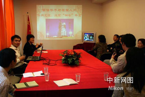 為了能與祖國共同見證這一歷史性意義的一刻,中國駐法使館教育處組織留法學(xué)子共同觀看了“神七”發(fā)射的直播節(jié)目。當(dāng)大家通過屏幕看到“神七”成功問天時(shí),所有人都興奮地鼓起了掌。直播結(jié)束后,教育處朱小玉公參主持召開了座談會(huì),大家共聚一堂、各抒己見。